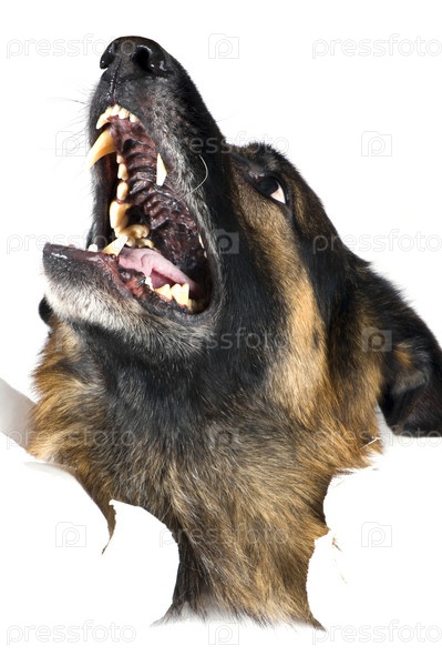 Овчарка выглядывает через отверстие в бумаге