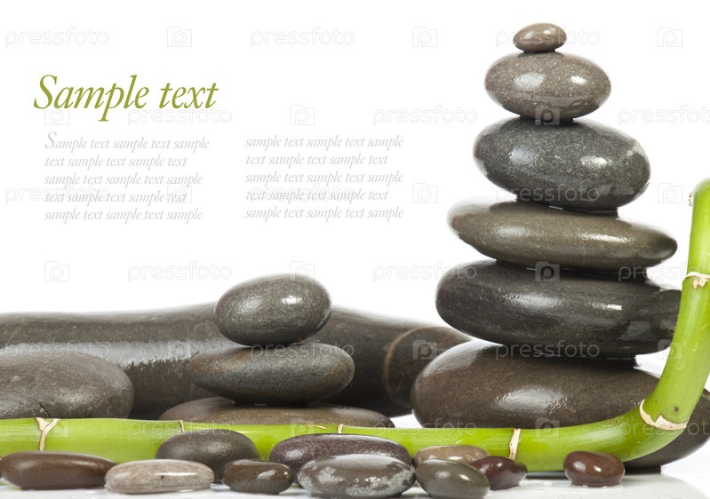 Скругленные камни для массажа и бамбук на белом фоне
