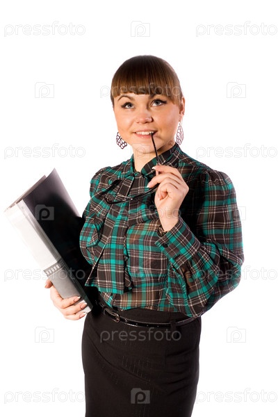 Девушка в деловом костюме с черной папкой смотрит вверх и улыбается на белом фоне