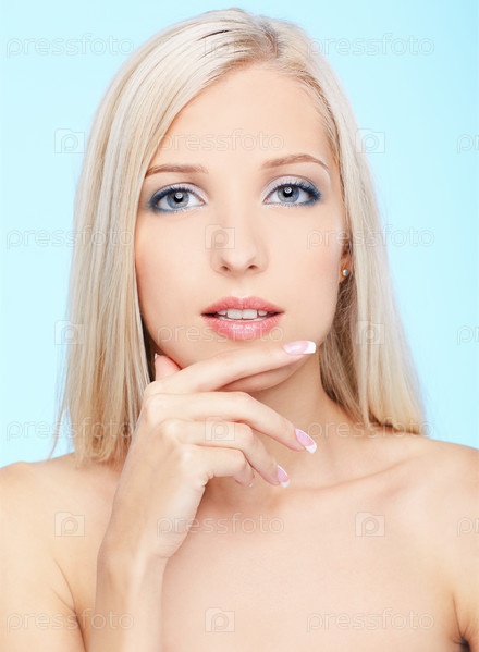 Портрет блондинки со здоровой кожей на голубом фоне