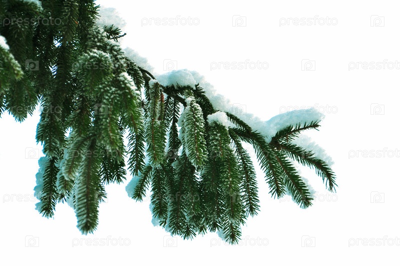 Заснеженная сосновая ветка на белом фоне