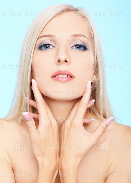 Портрет блондинки со здоровой кожей на голубом фоне