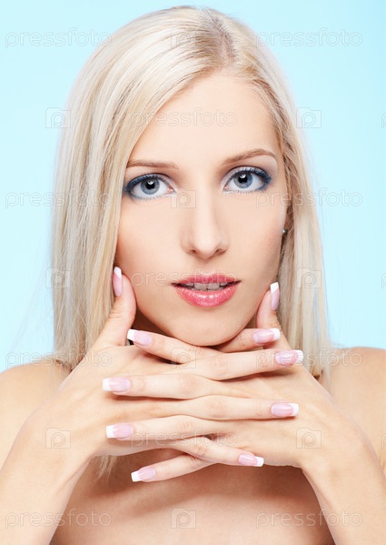 Портрет блондинки со здоровой кожей на голубом фоне