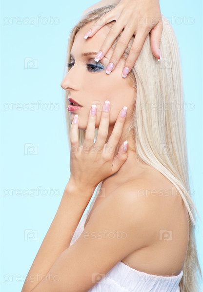 Портрет блондинки со здоровой кожей на голубом фоне