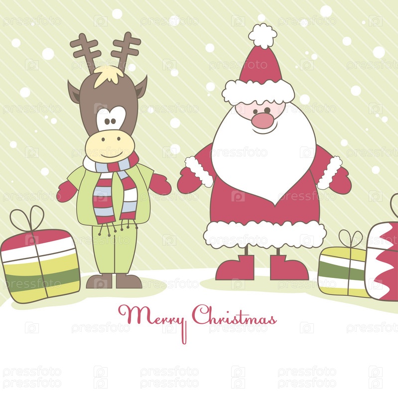 Веселая рождественская открытка с Санта-Клаусом, оленем и подарками