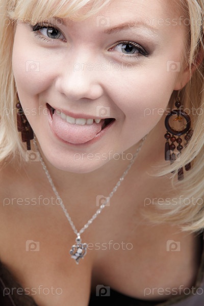 Портрет красивой девушки со светлыми волосами, которая показывает язык