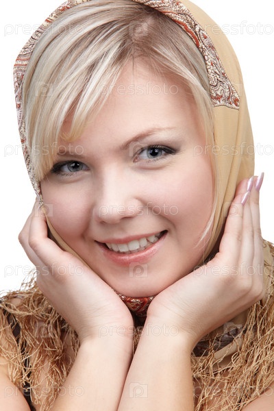 Портрет красивой девушки в платке с колосьями пшеницы