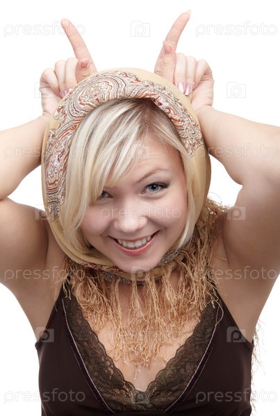 Портрет красивой девушки в платке, которая показывает рожки