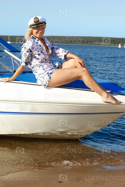 Девушка в фуражке капитана позирует на катере