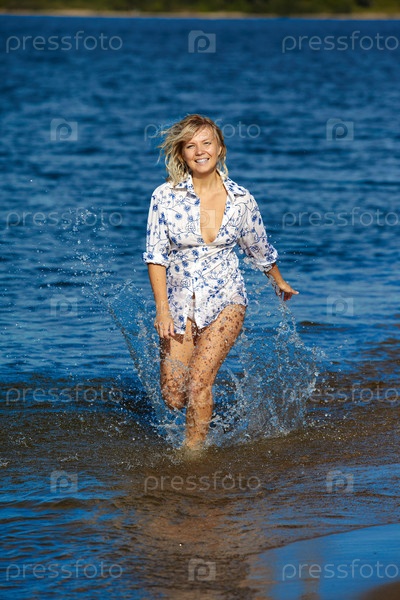 Счастливая девушка бежит по воде вдоль берега моря