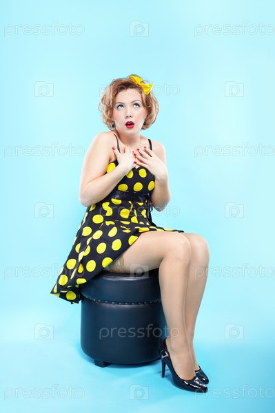 Удивленная девушка сидит на пуфике, одетая в стиле ретро