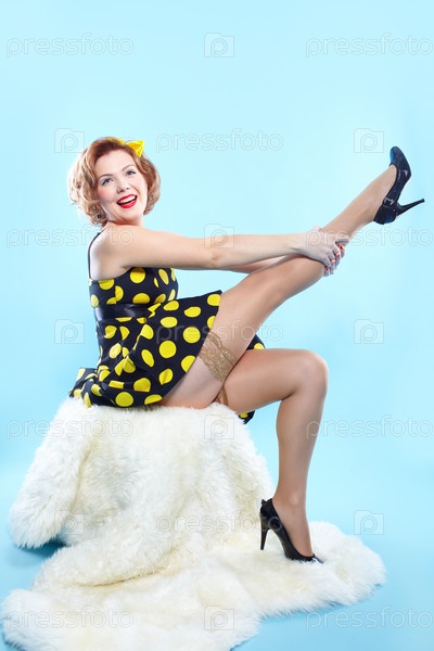 Девушка сидит на белом мехе, одетая в стиле ретро