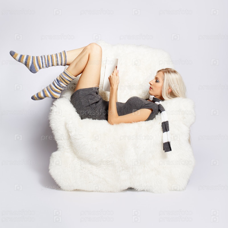 Блондинка в полосатых гольфах лежит в белом кресле и читает книгу