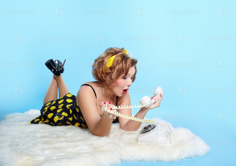 Удивленная девушка, одетая в стиле ретро, лежит на белом мехе и разговаривает по телефону