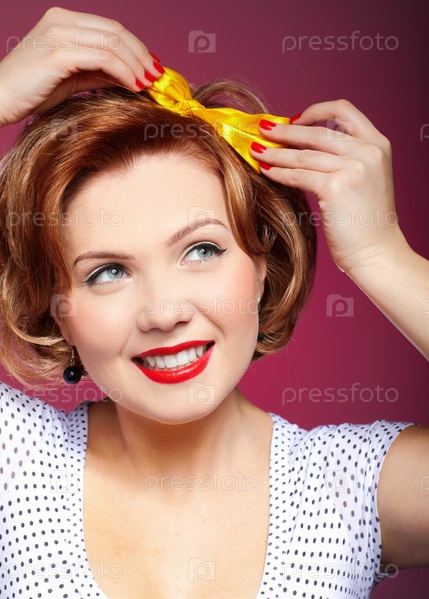 Улыбающаяся девушка, одетая в ретро стиле, поправляет бантик на голове