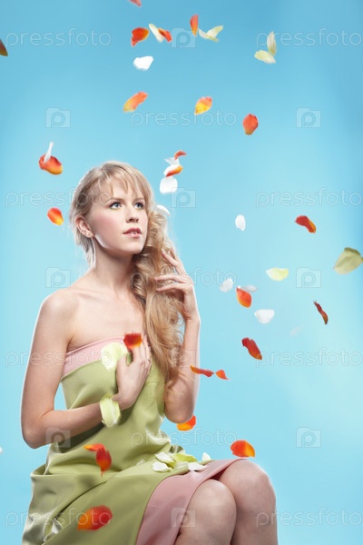 Красивая девушка с длинными светлыми волосами в лепестках роз