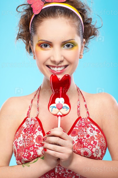 Улыбающаяся девушка с леденцом в виде кролика