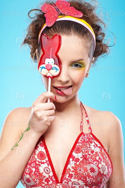 Девушка показывает язык и держит в руке леденец в виде кролика