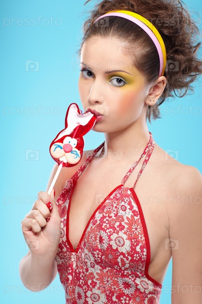 Девушка держит в руке леденец в виде кролика