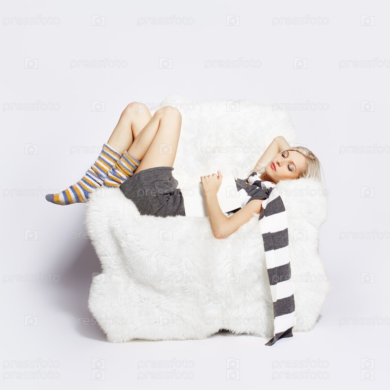 Блондинка спит с книгой в большом белом кресле