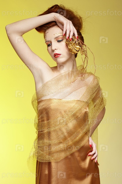 Девушка-осень. Портрет девушки с рыжими волосами в золотистом платье с сухими веточками