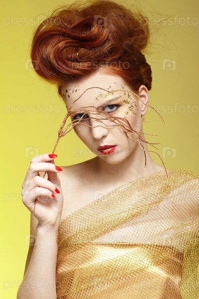 Девушка-осень. Портрет девушки с рыжими волосами в золотистом платье с сухими веточками