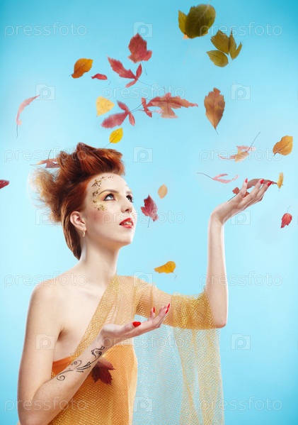 Девушка-осень. Портрет рыжеволосой девушки с падающими осенними листьями