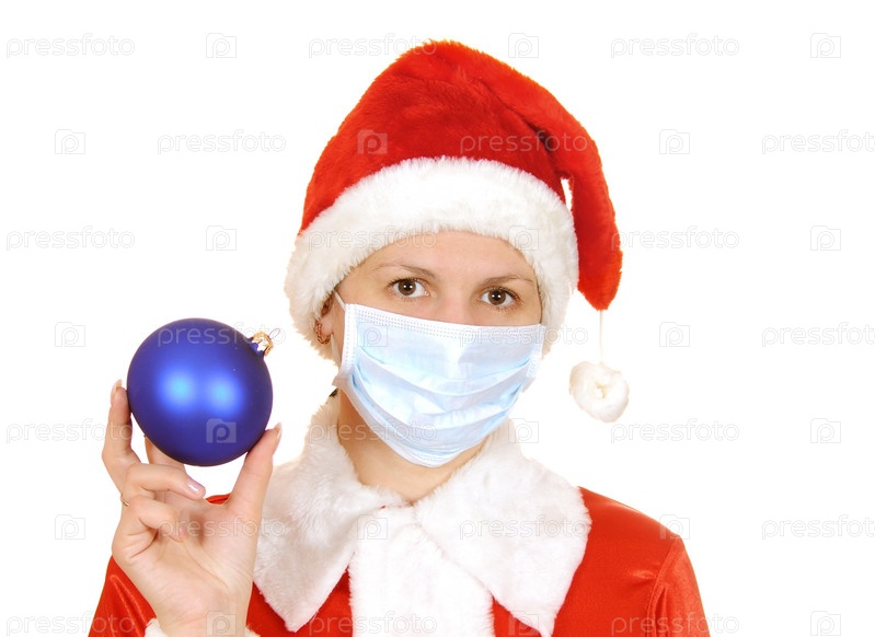 Дед Мороз в медицинской маске и елочным шаром