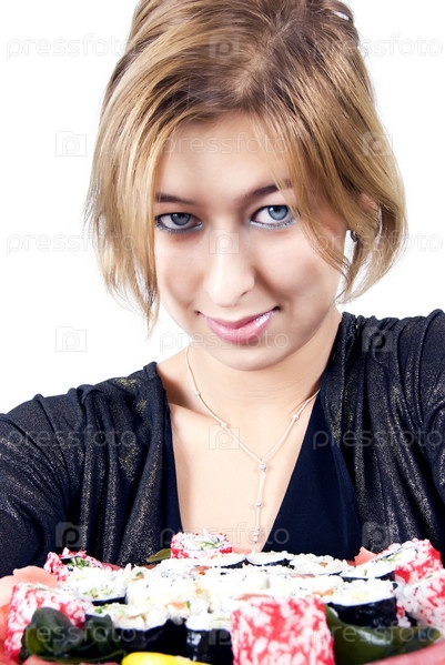 Привлекательная девушка держит суши