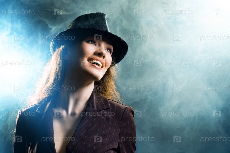 Девушка в шляпе и темном костюме
