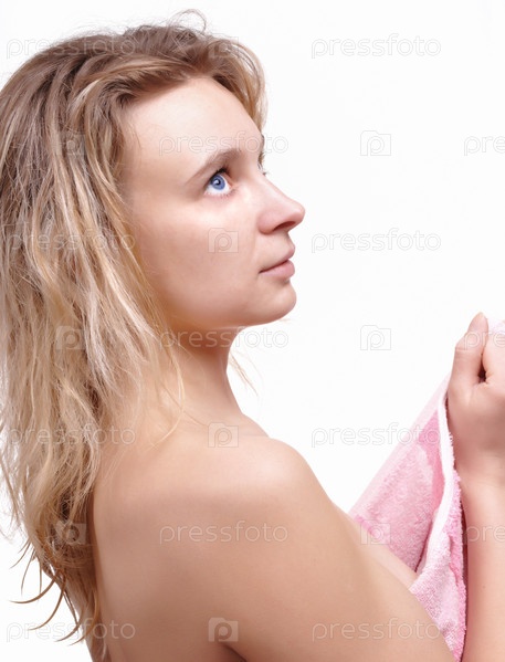 Портрет веселой молодой взрослой девушки, смотрящей вверх с полотенцем