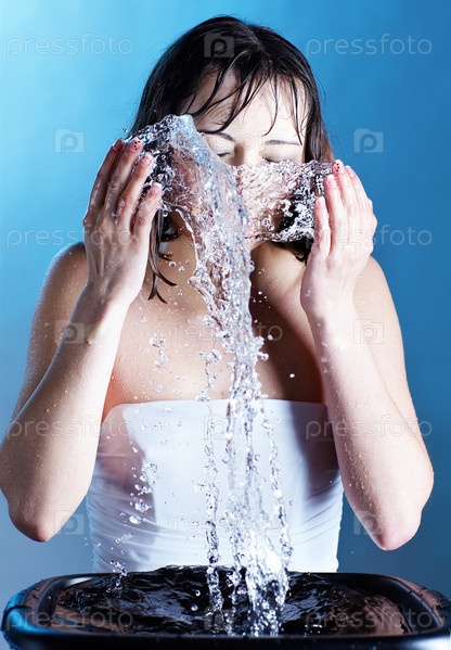 Брюнетка умывает лицо на синем фоне