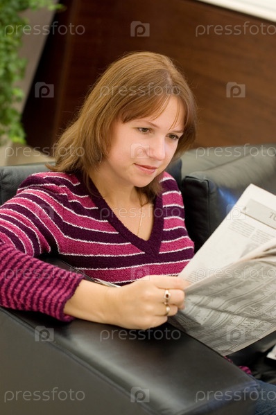 Девушка читает газету в кресле