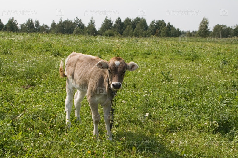 Теленок пасется на лугу
