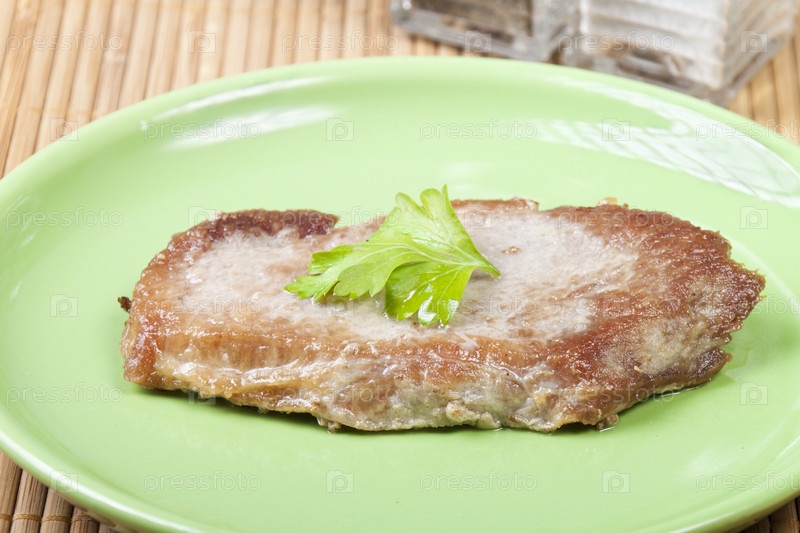 Жареный стейк из свинины и зелень петрушки на зеленой тарелке