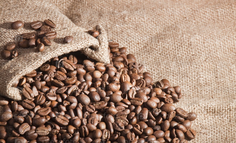 Коричневые кофейные зерна высыпались из брезентового мешка на фоне мешковины