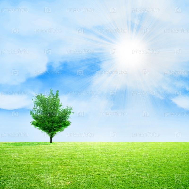 Одинокое дерево на фоне солнечного света и голубого неба