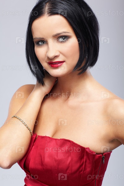 Портрет красивой брюнетки в красном топе