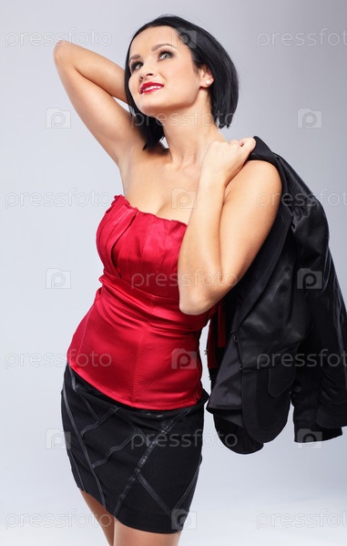 Красивая брюнетка позирует в элегантном костюме