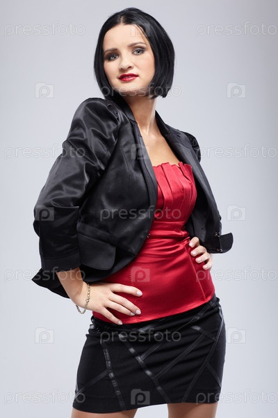 Красивая брюнетка позирует в элегантном костюме