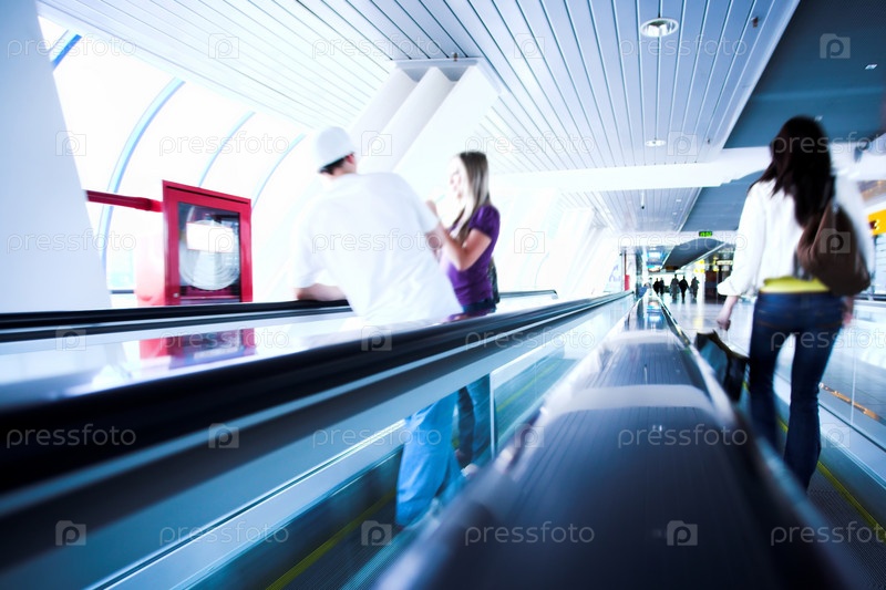 Люди, перемещающиеся на эскалаторе по стеклянному мосту