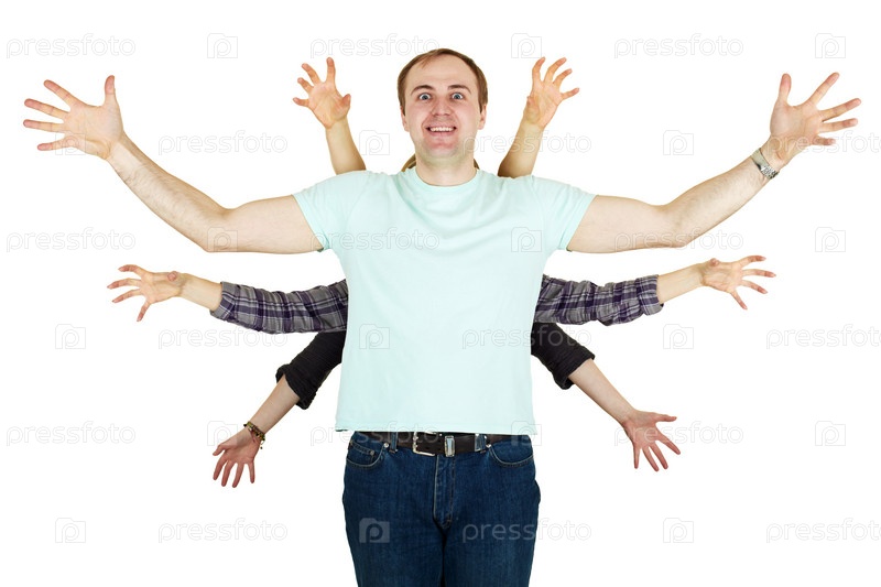 Люди стоят друг за другом, изображая многорукого человека, на белом фоне
