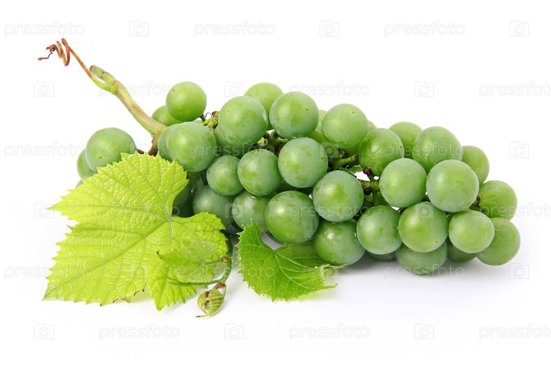 Свежие плоды винограда с зелеными листьями на белом фоне