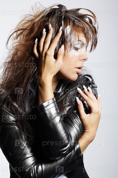 Девушка в кожаной куртке с окрашенным серебром лицом и волосами