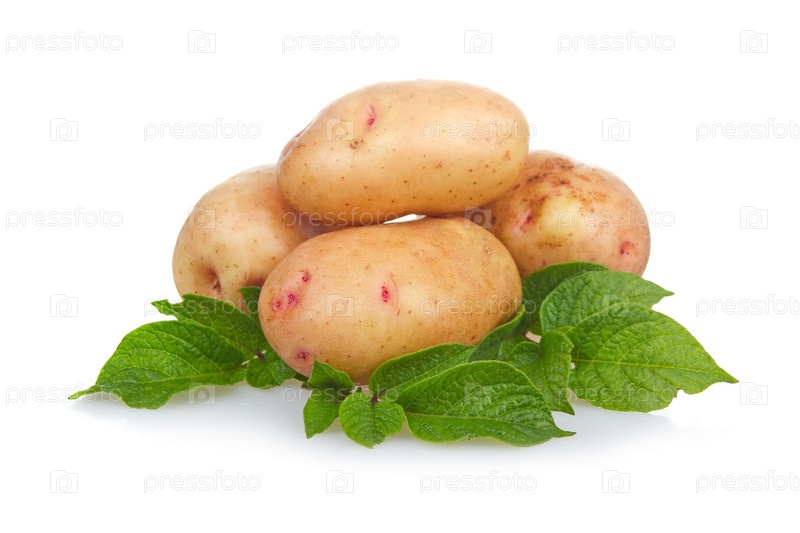 Свежий картофель с зелеными листьями на белом фоне