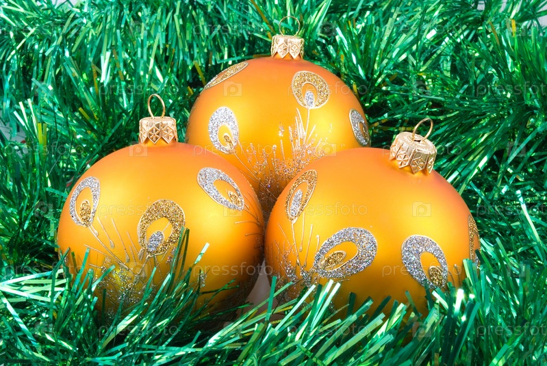 Три желтых елочных шара на фоне зеленой мишуры