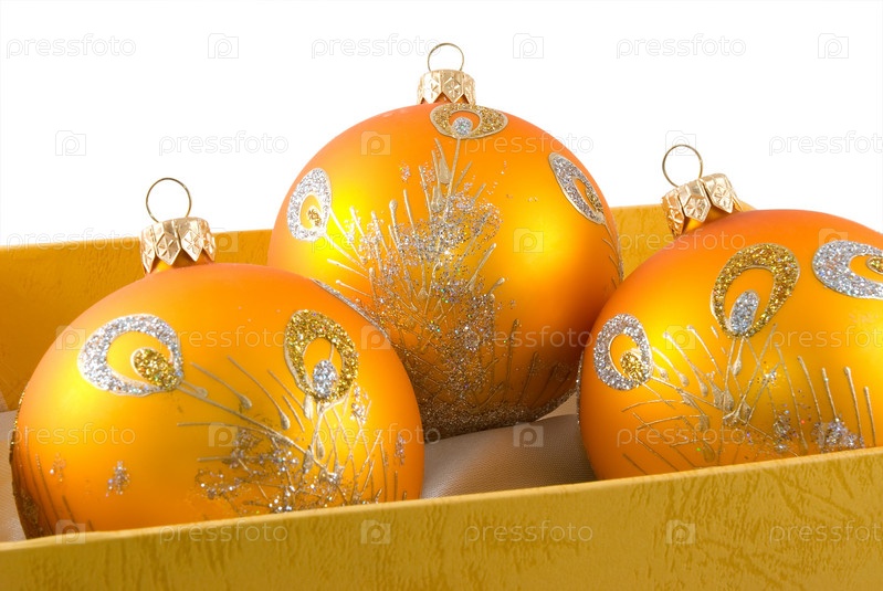 Три желтых елочных шара в желтой коробке на белом фоне