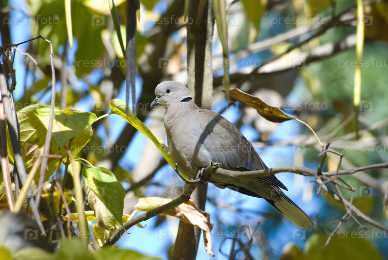 Серый голубь сидит на дереве