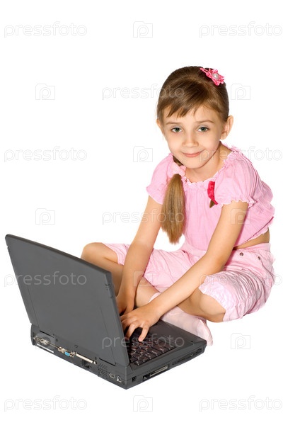 Девочка в розовой одежде сидит перед черным ноутбуком на белом фоне