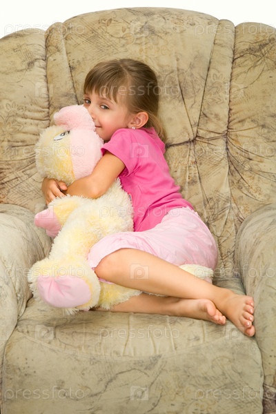 Девушка в розовой одежде лежит в кресле и обнимает большую мягкую игрушку на белом фоне